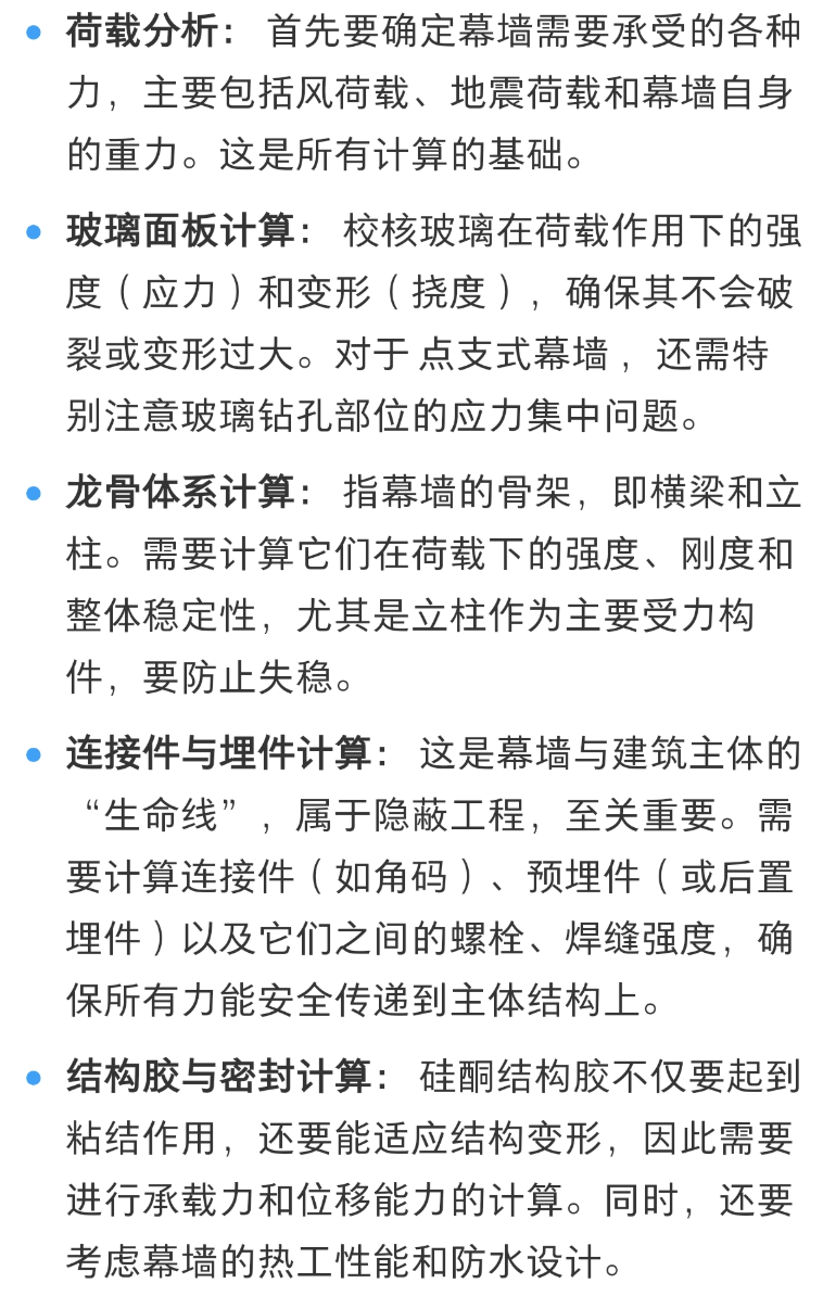 这就意味着:改动玻璃幕墙任一位置,都要整体来计算受力。而这些受力计算包含荷载计算、玻璃面板计算、龙骨体系计算、连接件与预埋件计算等。(如下图)
