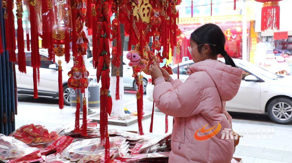 喜庆的氛围弥漫在江华沱江镇的大街小巷。在节庆挂饰店里,顾客们驻足徘徊,精心挑选着琳琅满目的年饰,如春联、红包、鱼形挂饰、灯笼、中国结、福字挂饰等,每一件都承载着对新年的期许。