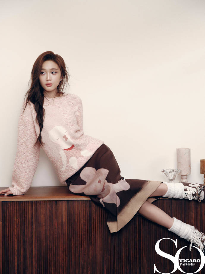 吴宣仪穿着粉色毛衣,侧坐在墙边。