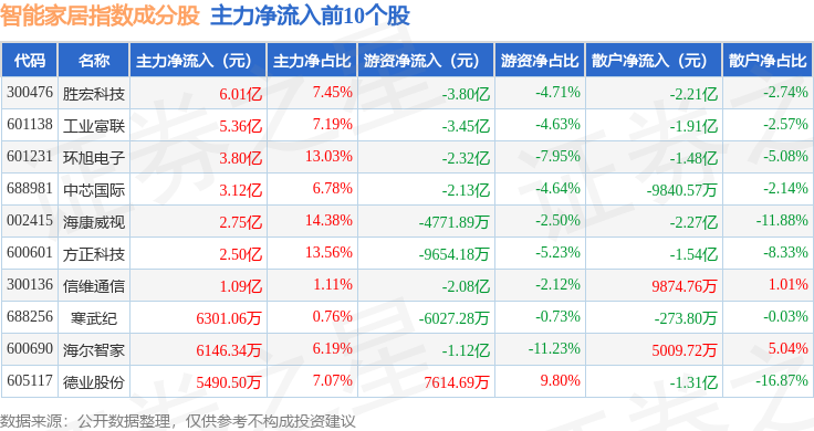 资金流向方面,智能家居(399996)指数成份股当日主力资金净流出合计2.84亿元,游资资金净流出合计14.82亿元,散户资金净流入合计17.66亿元。成份股资金流向详情见下表: