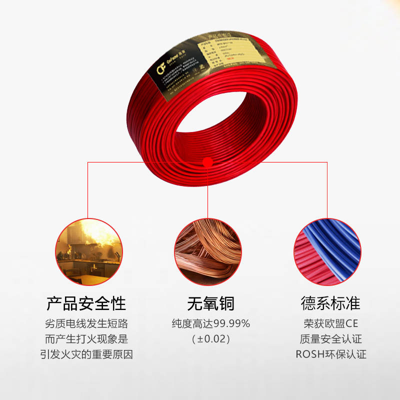 昂翡电线的导体采用高纯度无氧铜,纯度高达99.99%(±0.02),超低电阻率使线路电损耗极小,更节省电费。其绝缘层采用环保材料,产品符合欧盟RoHS环保标准,能达到离火自熄,大大降低短路引发火灾的风险。特别是低烟无卤阻燃电线,可在90°高温下正常工作,在发生火灾时不产生浓烟和无毒气体,保障家人用电安全。在家庭厨房、阳台这些容易发热的地方使用,让人更加放心。万一遇到火灾,电线不会释放有毒有害气体,能为家人逃生多留时间;而且耐高温性能好,夏天大功率电器同时使用也不容易烧坏,减少电路故障风险。