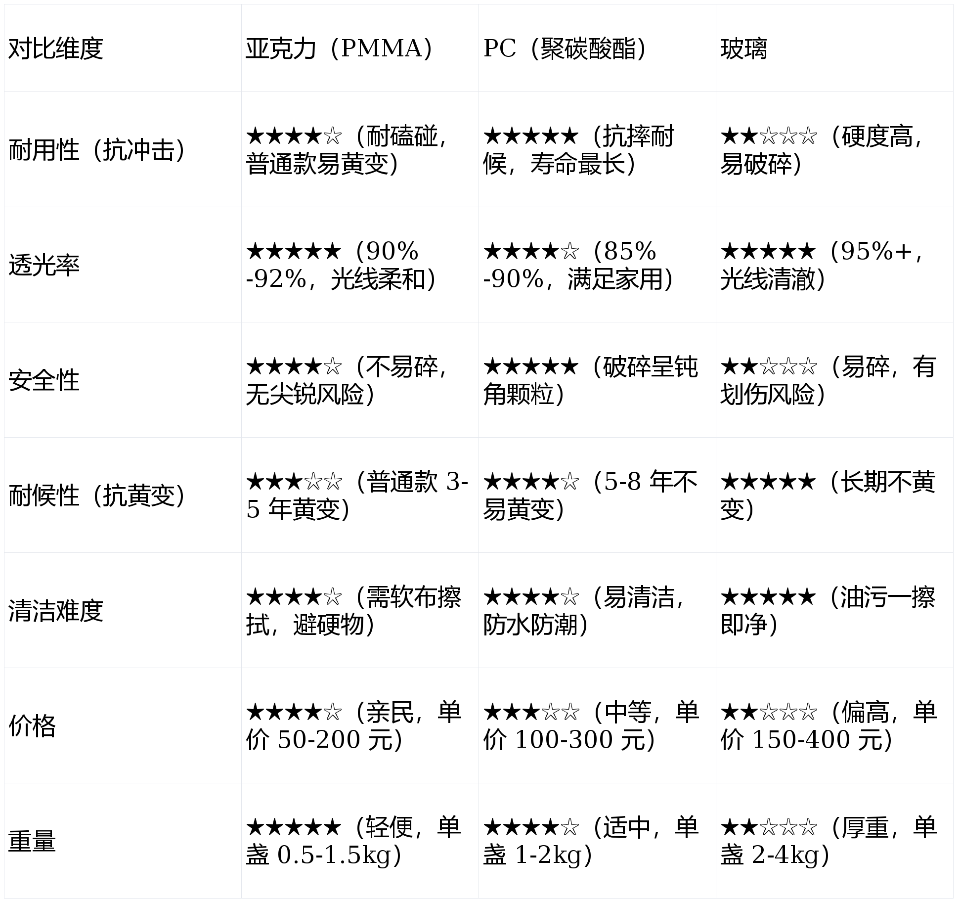 6. 首选 PC 材质,抗紫外线能力强,长期暴晒不易黄变、脆化,适配户外光照环境;坚决避开普通亚克力,否则 1-2 年就可能出现透光率下降、表面开裂等问题。