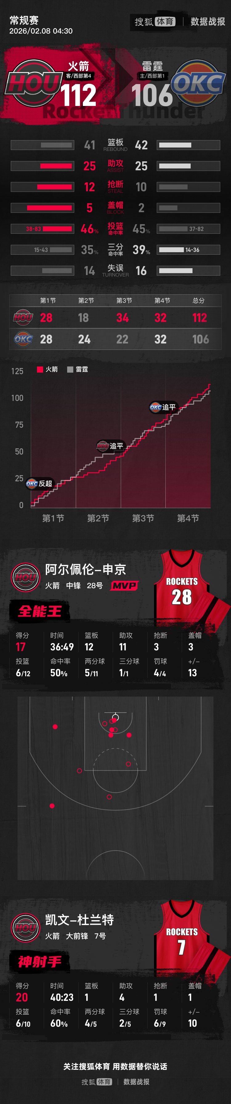【搜狐体育战报】北京时间2月8日NBA常规赛,客场作战的火箭以112-106击败雷霆。申京17分12篮板11助攻,霍姆格伦17分14篮板0助攻。