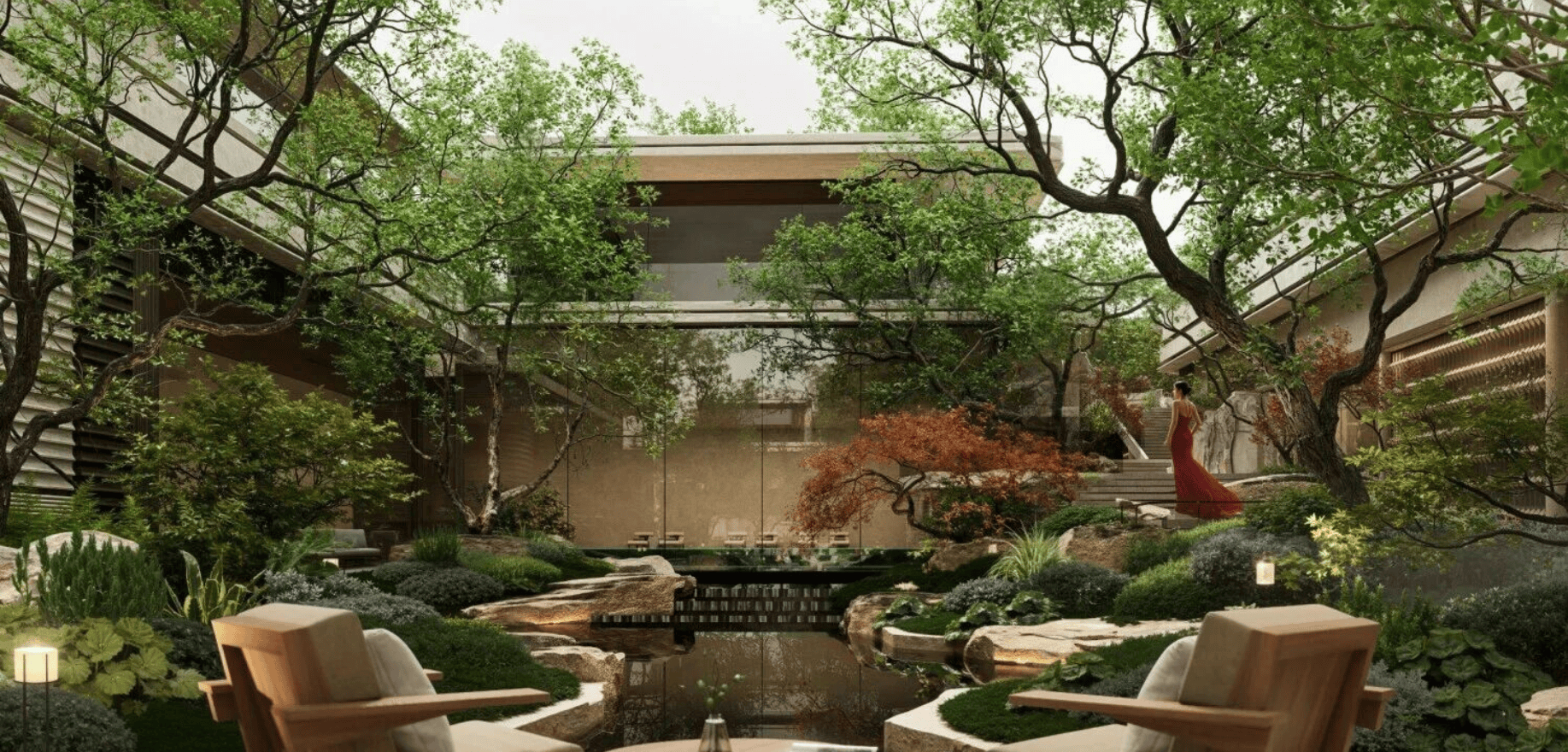 中铁·云岫曲江,以“天人合一、无界交融”理念,开创性打造“立体游弋”无界园林,由外至内,一园、一院、四境、六弋层层迭进,打造“无界天地任逍遥”的栖心世界。