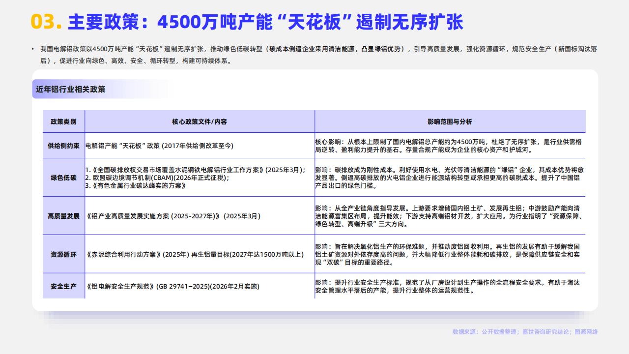 当前,国内铝工业的核心框架受到明确的政策约束。其中,电解铝产能4500万吨的“天花板”自2017年设定以来,已成为行业不可逾越的红线,彻底遏制了过去的无序扩张,推动市场竞争从增量争夺转向存量博弈。与此同时,碳排放权交易市场的深化与欧盟碳边境调节机制的实施,使得绿色低碳转型从倡议变为刚性成本。这显著提升了使用水电、光伏等清洁能源生产的“绿铝”的竞争优势,倒逼整个行业加快能源结构优化与能效提升的步伐。系列高质量发展方案亦从资源保障、循环利用、安全生产等多维度,为产业升级指明了方向。