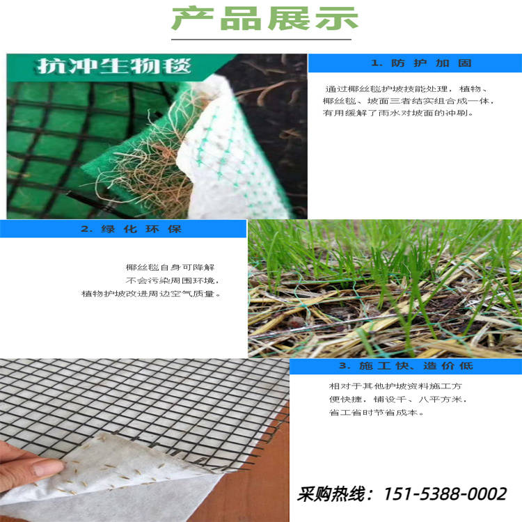 【抗冲击力强,抵御自然】采用生物材料,赋予植生毯的抗冲击性能,有效抵御洪水、风蚀等自然力量的侵袭,保护生态脆弱的区域免受进步破坏。