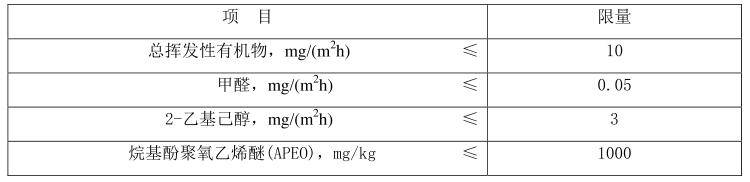 总挥发性有机物(VOC)、甲醛、2-乙基己醇、烷基酚聚氧乙烯醚(APEO)应符合以下限量要求。