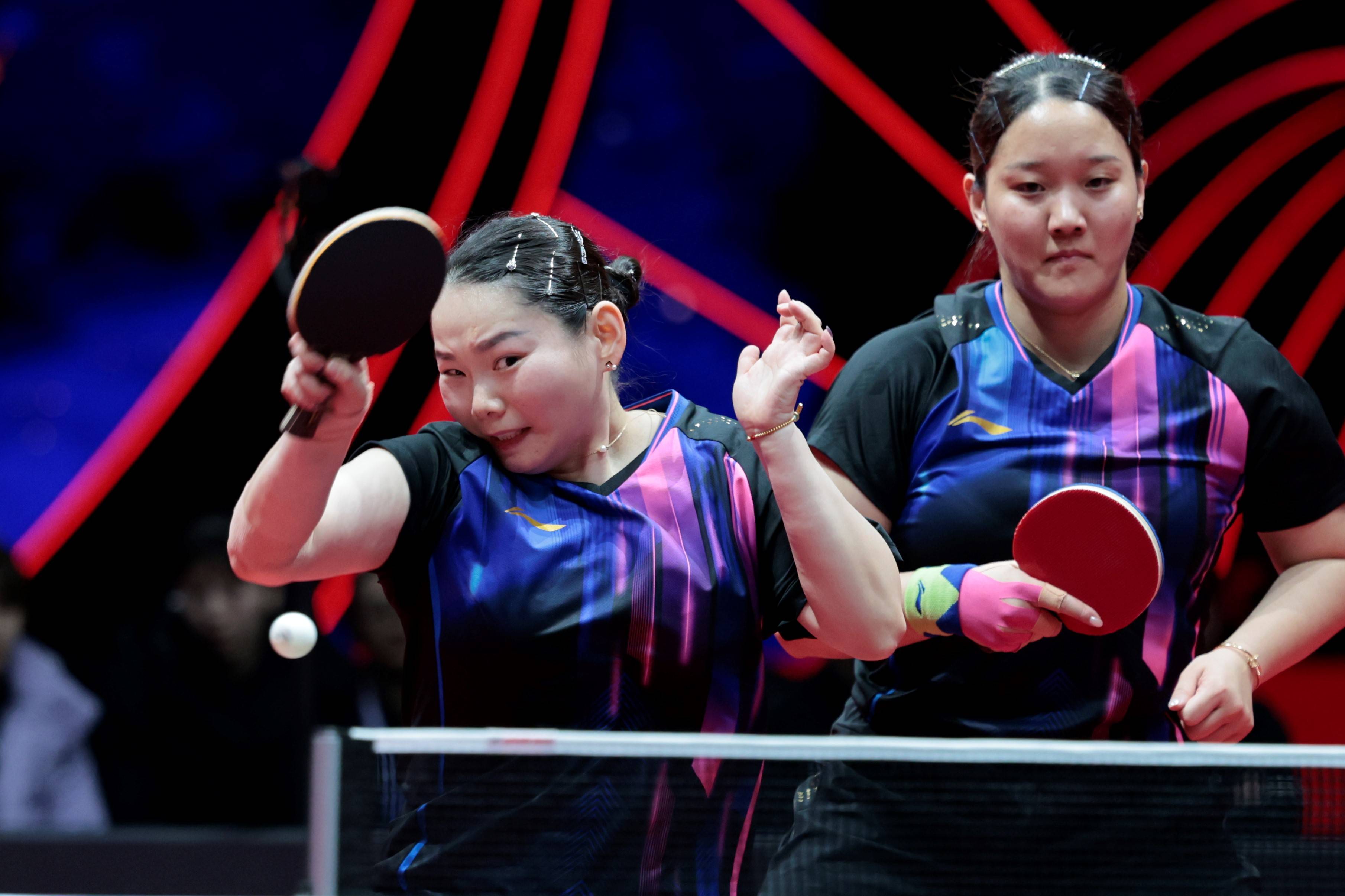 12月26日,上海龙腾队组合孙铭阳/何卓佳(左)在女双比赛中。她们2比3不敌深圳大学队组合覃予萱/平野美宇。 新华社发(刘臻睿摄)