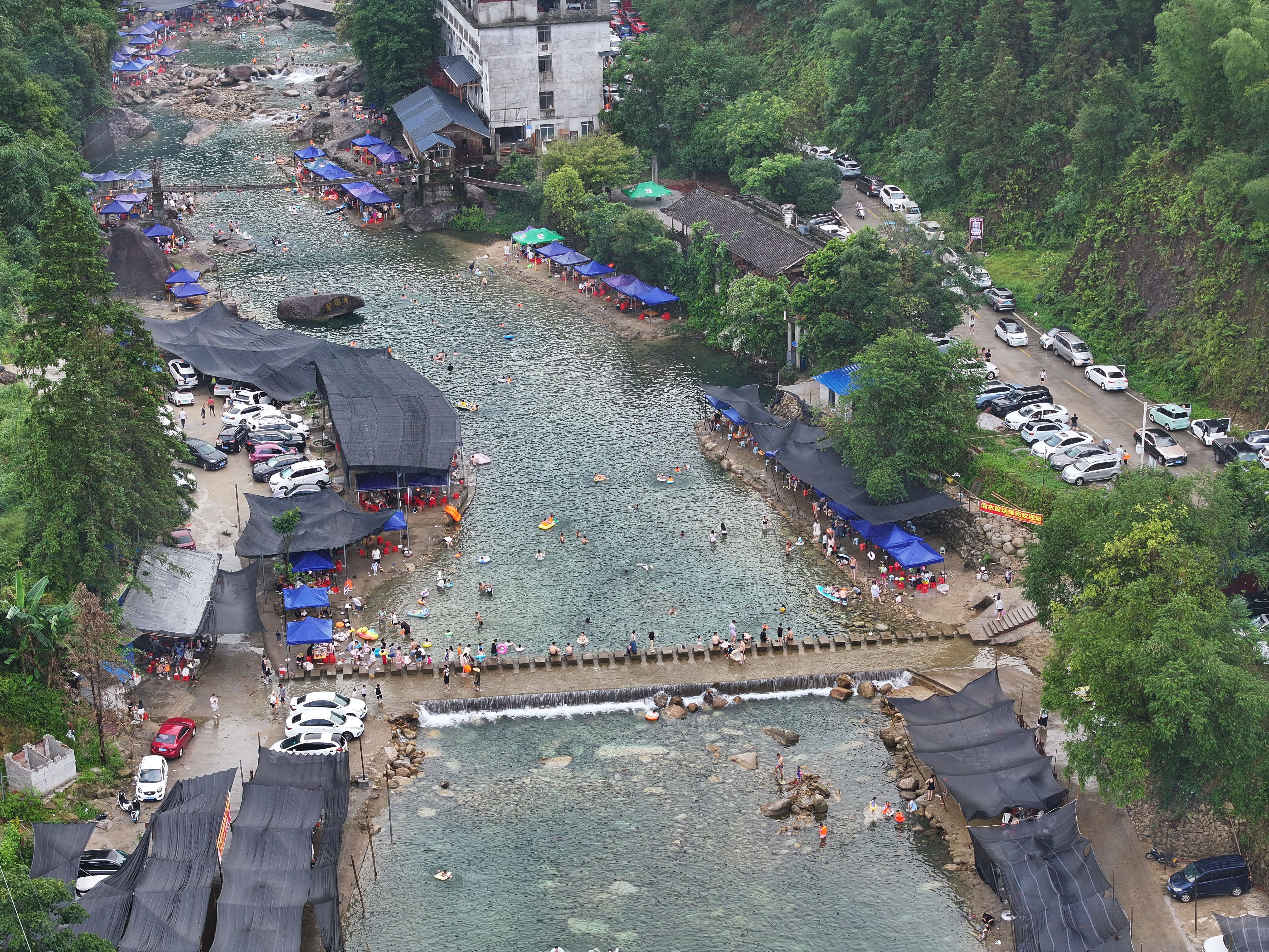 游客在广西融水苗族自治县香粉乡中坪村戏水消暑(7月19日摄,无人机照片)。 新华社记者 黄孝邦 摄